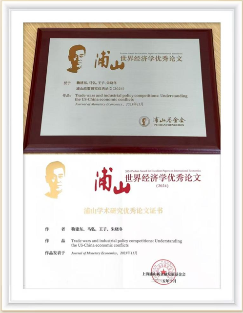 2025年10月24日,清华大学五道口金融学院教授鞠建东、清华大学经济管理学院教授马弘、香港浸会大学工商管理学院副教授王子、香港大学经管学院教授朱晓冬合著发表的论文《贸易战与产业政策竞争:理解中美经贸冲突》(Trade Wars and Industrial Policy Competition: Understanding the US-China Economic Conflicts)荣获“浦山政策研究优秀论文(2024)”,该论文于2024年在著名国际期刊《货币经济学期刊》(Journal of Monetary Economics)发表。