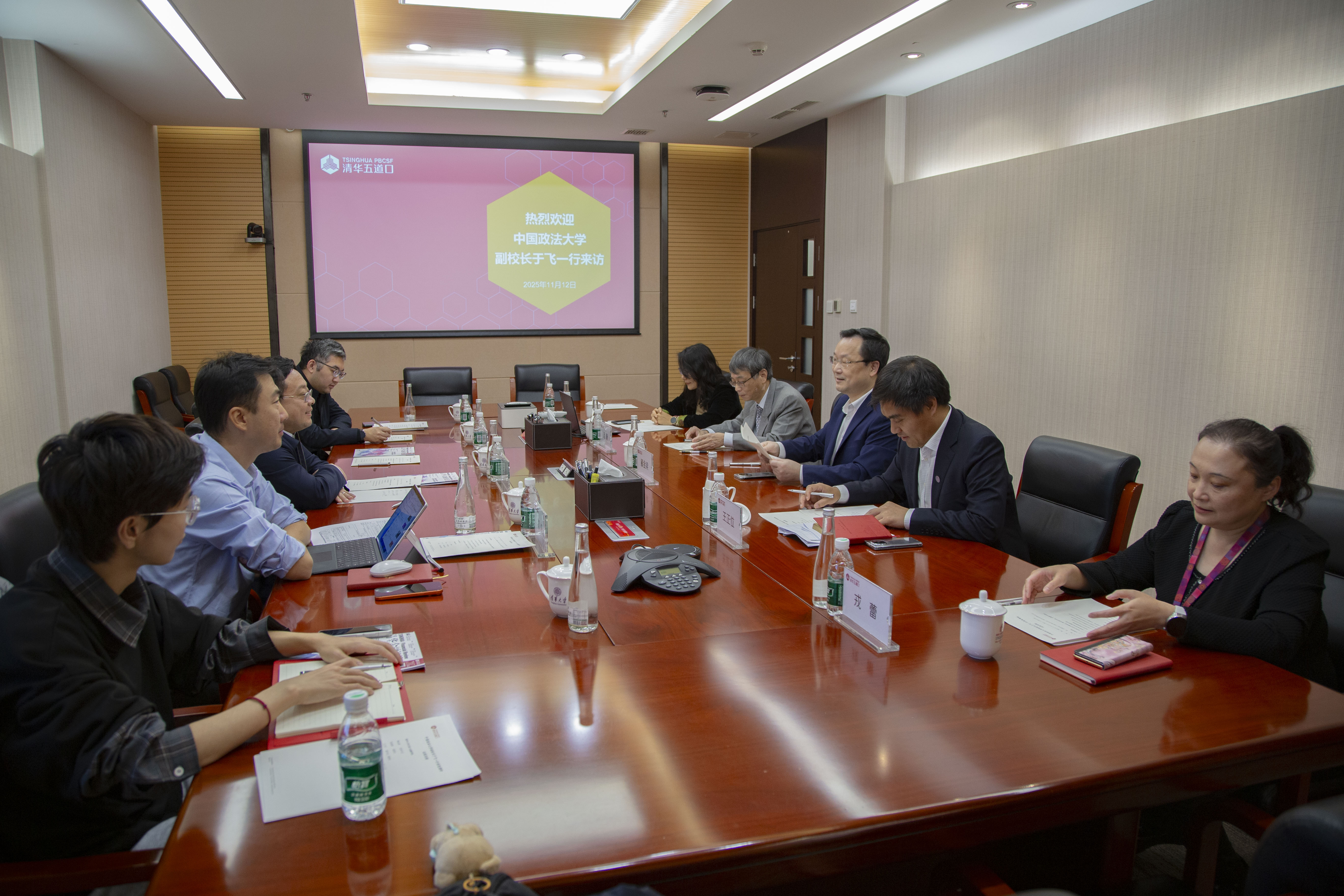 2025年11月12日,中国政法大学副校长于飞、首都研究院院长郭烁、副院长赵中名一行访问清华大学五道口金融学院进行调研。清华大学五道口金融学院党委书记郦金梁,副院长张晓燕,党委副书记、副院长王正位等出席会议。