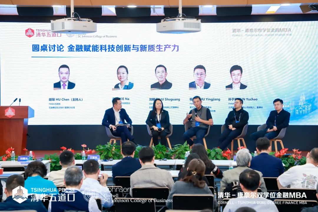 Vishal Gaur院长演讲结束后,本次论坛主旨演讲环节圆满落幕,随后正式进入两场圆桌论坛环节。金融赋能科技创新与新质生产力圆桌由FMBA五期班校友、花旗集团投资银行董事总经理胡琛主持,港京科技研究院院长谢娜,GSFD六期班校友、巨鹏生物控股集团有限公司董事长刘曙光,FMBA首期班校友、黄河实业有限公司董事长、山西东义煤电铝有限公司总裁穆映江,FMBA二期班校友、北京曜能科技有限公司创始人、董事长孙于超四位嘉宾组成。嘉宾认为,科技创新投入高、周期长,亟需长线耐心资本支撑;金融在能源转型、基础设施建设、初创企业成长中发挥关键作用,香港国际金融中心可与北京科创中心优势互补,政府资金与市场化资本协同支持前沿研发。同时,当前金融赋能仍存在不足:新兴赛道认知偏差导致早期融资难、资产代币化等创新工具政策待落地、能源领域资本快速流动机制不完善。在AI时代,企业亟需电力 + 金融、科技 + 金融的复合型人才,重视人类创新力与终身学习能力,推动 AI 与产业深度融合,完善产融结合生态,助力新质生产力发展。