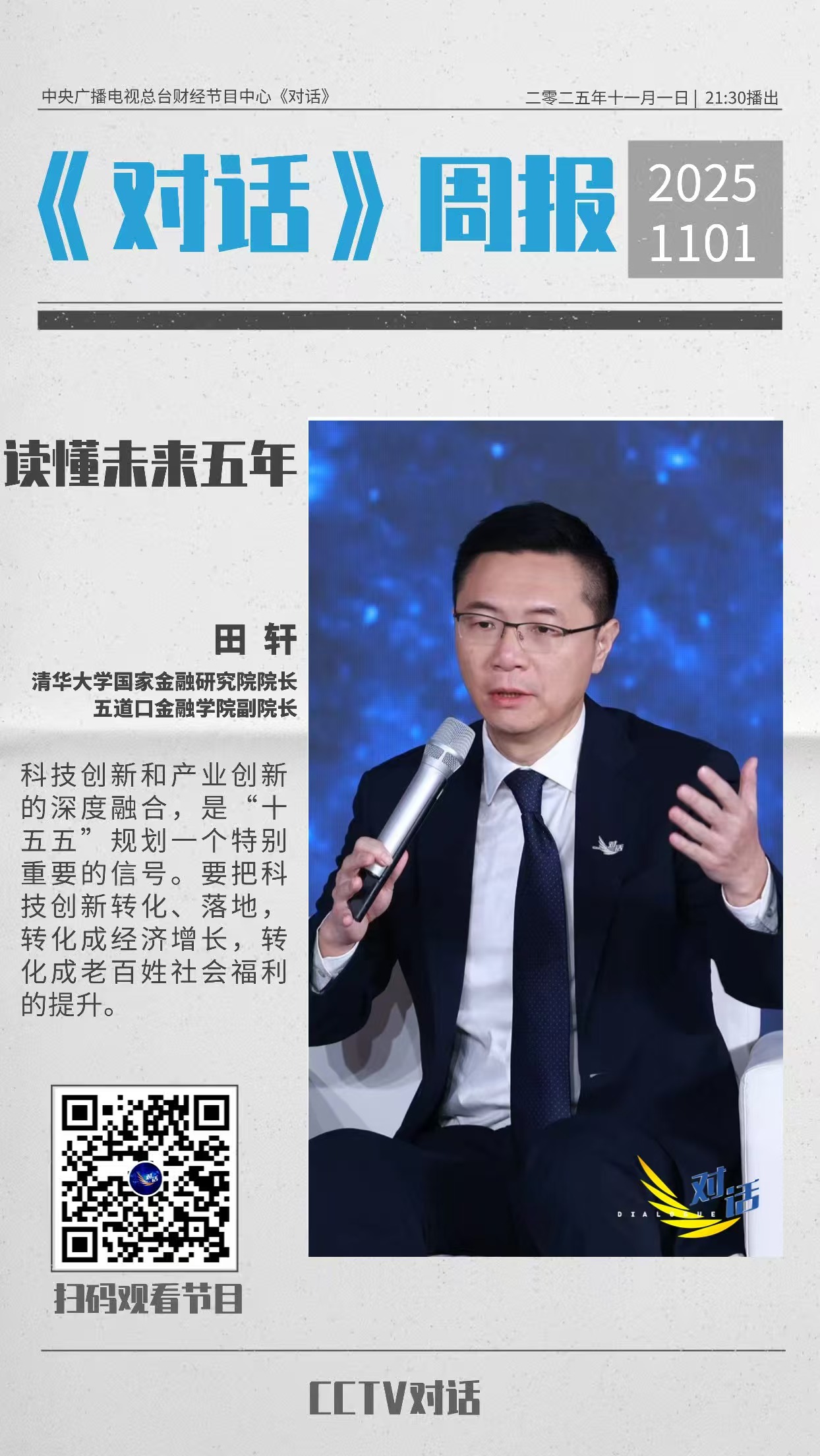 中国共产党二十届四中全会审议通过《中共中央关于制定国民经济和社会发展第十五个五年规划的建议》,立足中国式现代化全局,精准把握中国2026-2030年这一承前启后的关键历史方位,在基本实现社会主义现代化的“三步走”战略中起到夯实基础、全面发力的核心作用。对此,清华大学国家金融研究院院长、清华大学五道口金融学院副院长田轩围绕规划核心部署,在接受中央广播电视总台、CGTN、China Daily、大河财立方、澎湃新闻、上海证券报等多家媒体采访时,从高质量发展、科技自立自强、金融改革、开放合作等多维度展开深度解读,为未来五年发展路径提供权威参考。