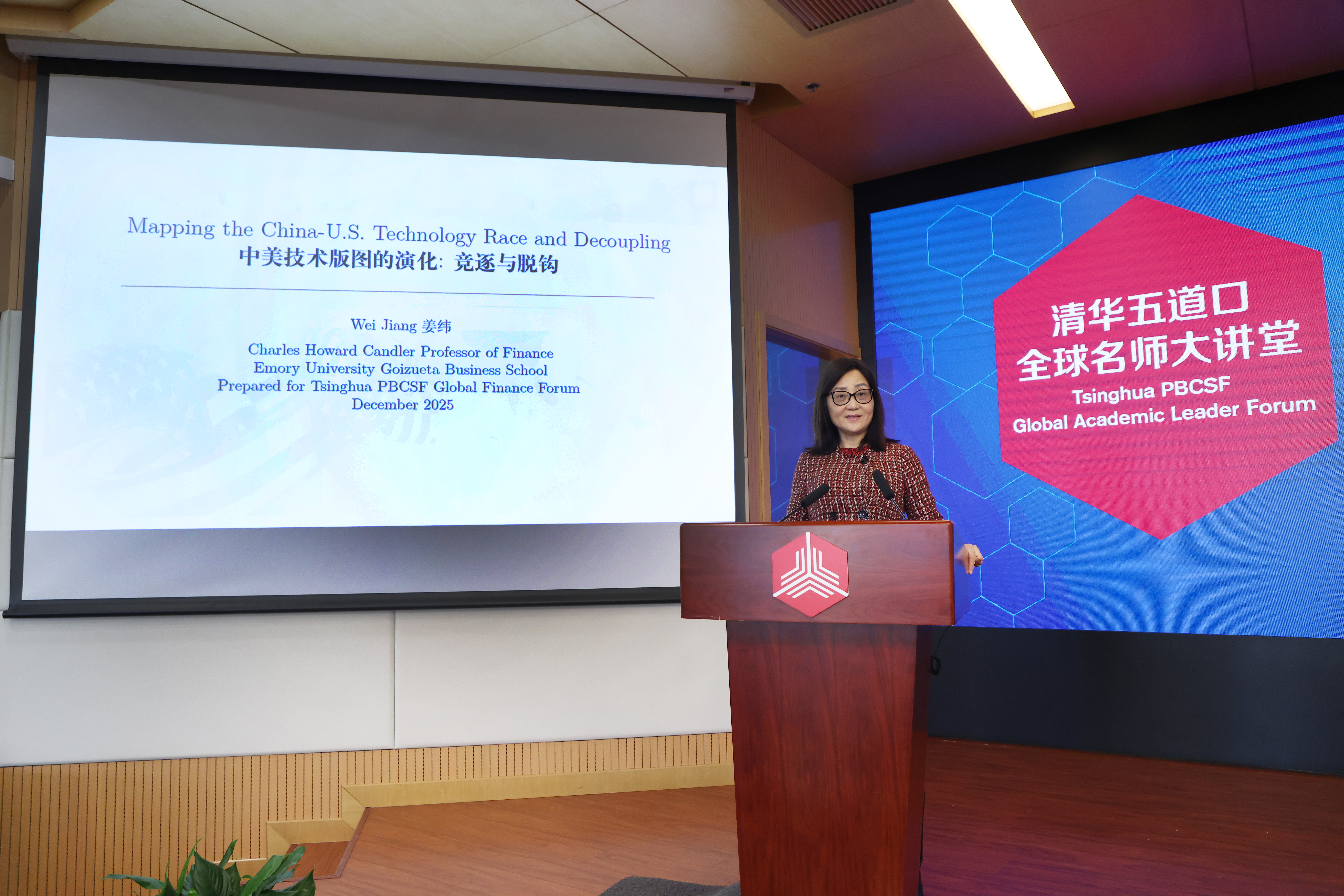 2025年12月24日,埃默里大学戈伊苏埃塔商学院主管师资副院长、查尔斯·霍华德·坎德勒金融学讲席教授姜纬做客清华五道口全球名师大讲堂,发表题为“Mapping the China-U.S. Technology Race and Decoupling(中美技术版图的演化:竞逐与脱钩)”的演讲。本次讲座由清华大学五道口金融学院主办,现场汇聚了来自多所高校与研究机构的130余名师生及研究人员。