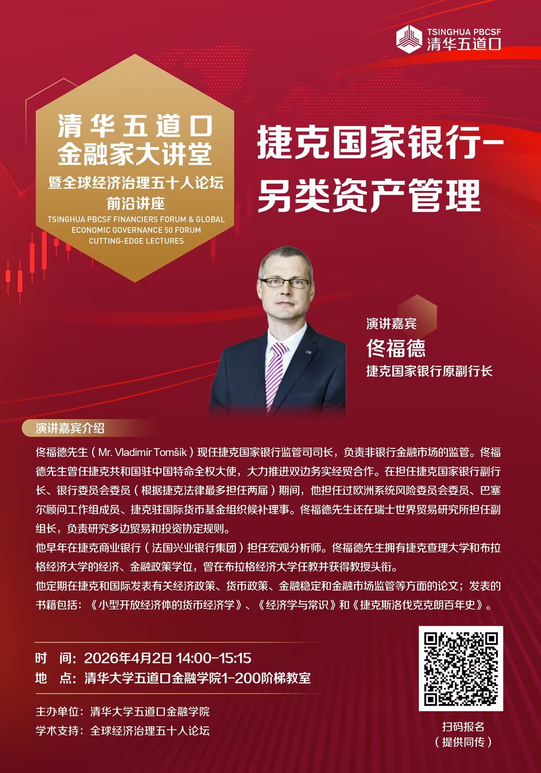 清华五道口金融家大讲堂暨全球经济治理五十人论坛前沿讲座将于4月2日在学院召开。本次讲座邀请捷克国家银行原副行长佟福德,他将以《捷克国家银行——另类资产管理》为主题,分享欧盟加密资产监管框架、捷克加密机构认证情况、以及捷克央行数字实验室的建立和实践。