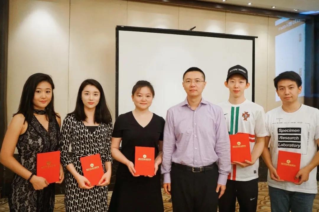 图为杨慕融(左一)荣获FMBA道口奖学金时与田轩老师(右三)合影